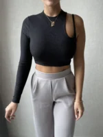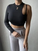 کراپ مجلسی شیک با طراحی خاص تک‌آستین، مناسب استایل‌های مجلسی و روزمره. انتخابی متفاوت برای ظاهری جذاب و مدرن.